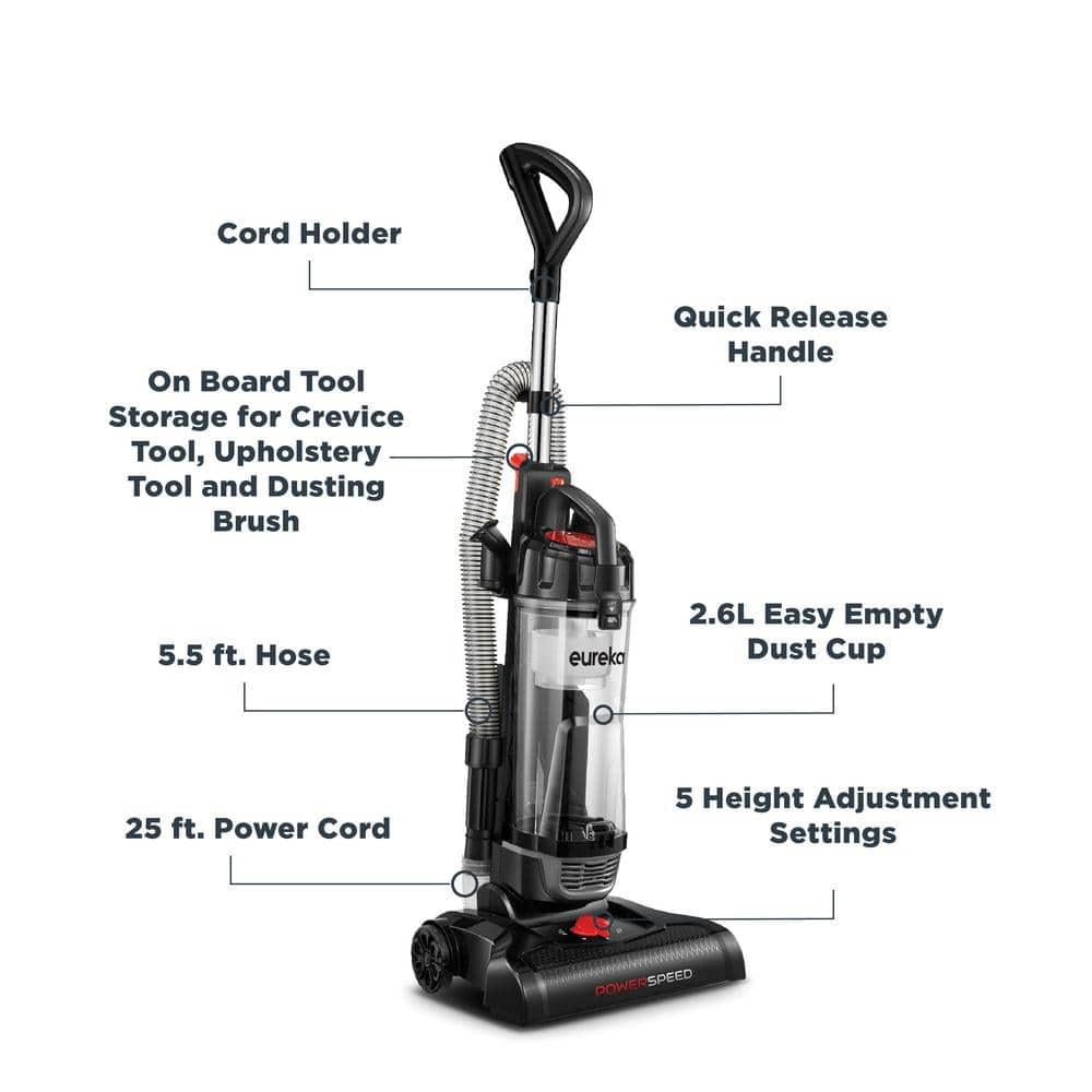 The Eureka NEU180 PowerSpeed Upright Bagless Vacuum in Black/Red delivers powerful, whole-home cleaning with a lightweight design that’s easy to maneuver. Engineered with a dynamic motor and multi-surface brush roll, it lifts stubborn dirt from carpets, rugs, and hard floors with ease. The extra-large dust cup means fewer interruptions, while the washable filter keeps maintenance simple and cost-effective. With a wide cleaning path and multiple height adjustments, it adapts to various floor types for optimal suction. The included accessories—crevice tool, dusting brush, and upholstery tool—make above-floor cleaning effortless. Whether tackling pet hair or everyday messes, the NEU180 offers reliable performance and convenience in one sleek package.